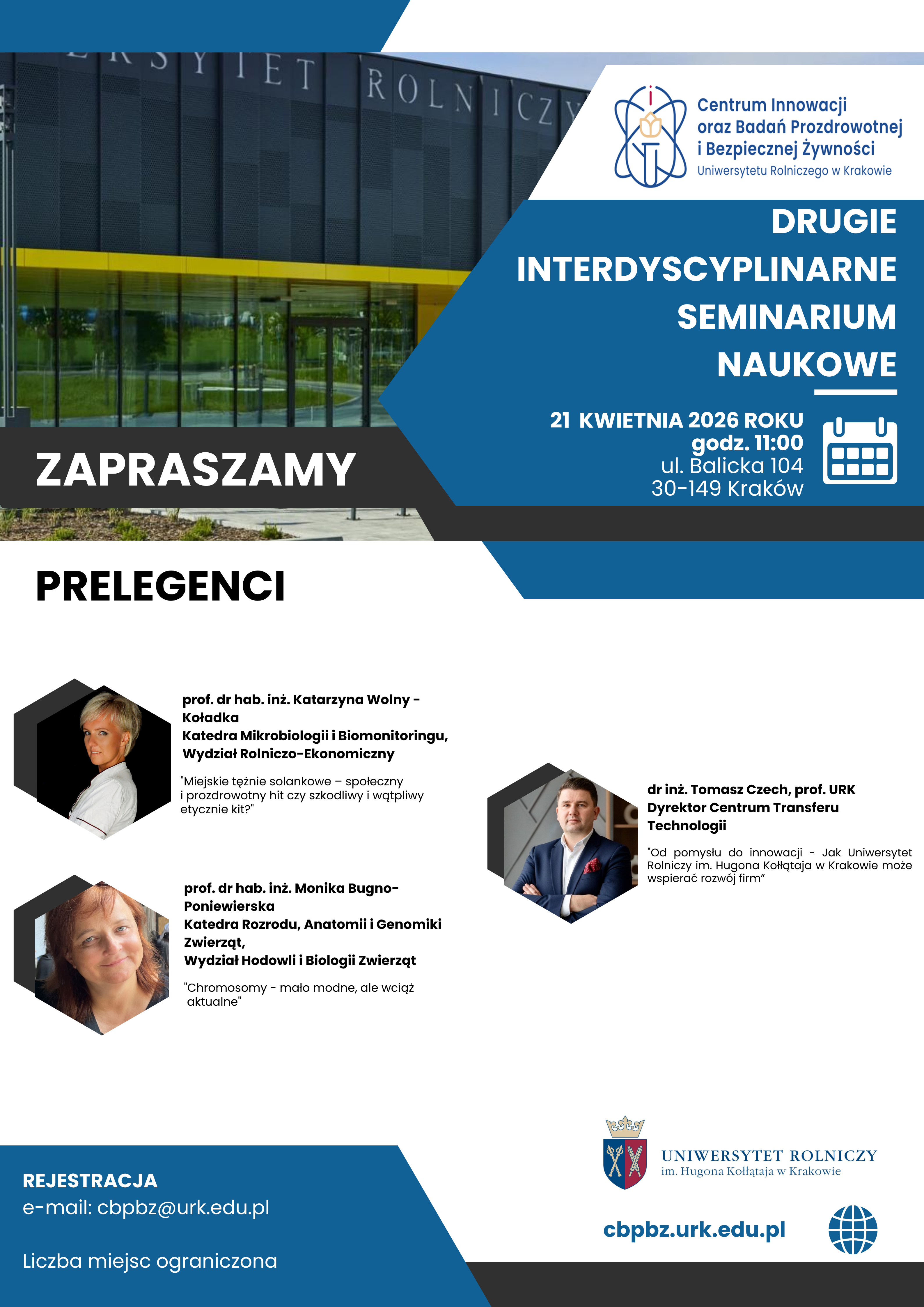 Centrum Innowacji oraz Badań Prozdrowotnej i Bezpiecznej Żywności Uniwersytetu Rolniczego w Krakowie zaprasza do udziału w Drugim Interdyscyplinarnym Seminarium Naukowym.