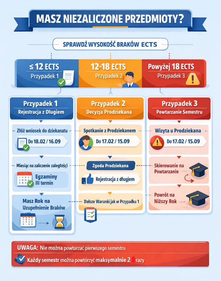 - Jeśli nie uzupełnisz braków – dziekan może skierować Cię na powtarzanie pierwszego niezaliczonego semestru.